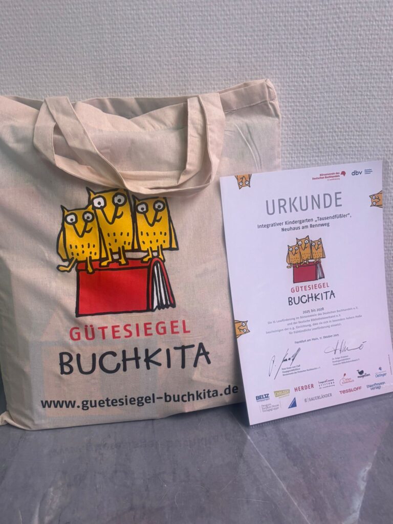 290 Einrichtungen hatten sich im Jahr 2025 für das Gütesiegel beworben. Insgesamt erhielten daraufhin 84 Kindergärten in ganz Deutschland die Auszeichnung für ihren besonderen Einsatz, Kinder früh für Geschichten und Sprache zu begeistern. Die Übergabe des Gütesiegels erfolgte am 17.10.2025 im Rahmen der Frankfurter Buchmesse. Zwei Kolleginnen aus dem Tausendfüssler waren in Frankfurt vor Ort und nahmen die Auszeichnung entgegen.