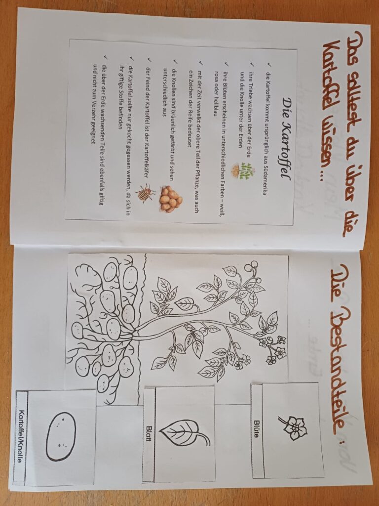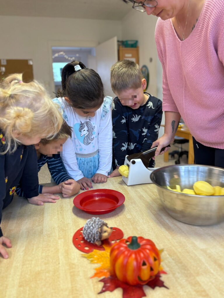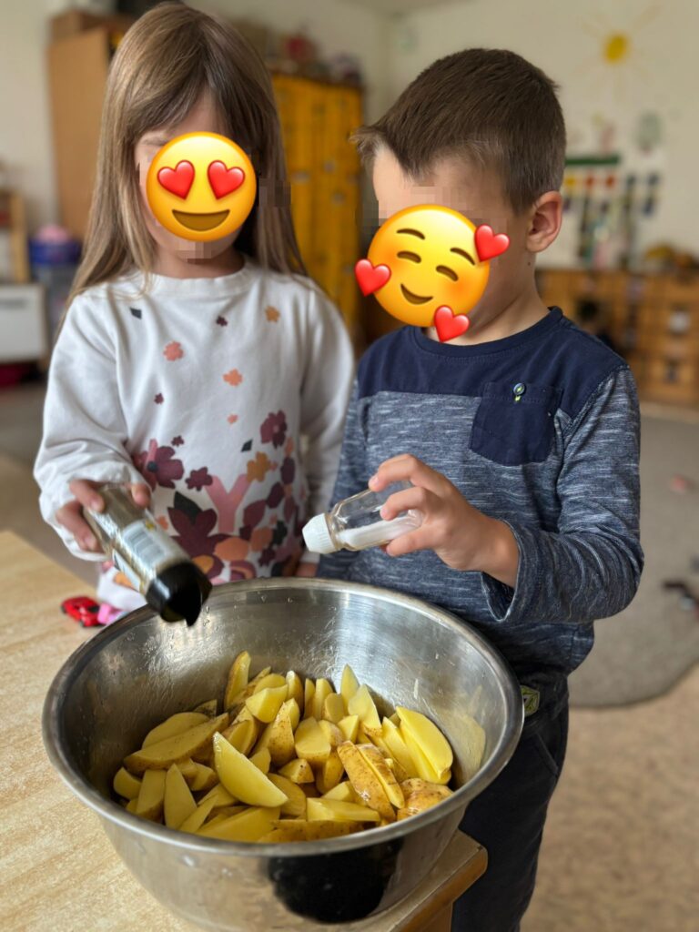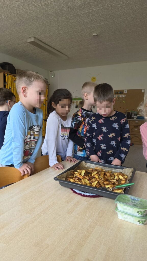 In einer anderen Gruppe drehte sich alles um die Kartoffel. Die Kinder erfuhren, wie die tolle Knolle wächst, welche Bestandteile sie hat und welche Wachstumsphasen sie durchläuft – vom winzigen Keimling bis zur reifen Kartoffel in der Erde. Natürlich durfte auch hier das eine Kostprobe nicht fehlen: Mit großem Einsatz halfen alle Kinder bei der Zubereitung von knusprigen Kartoffelpommes, die anschließend gemeinsam gegessen wurden – ein echtes Highlight!