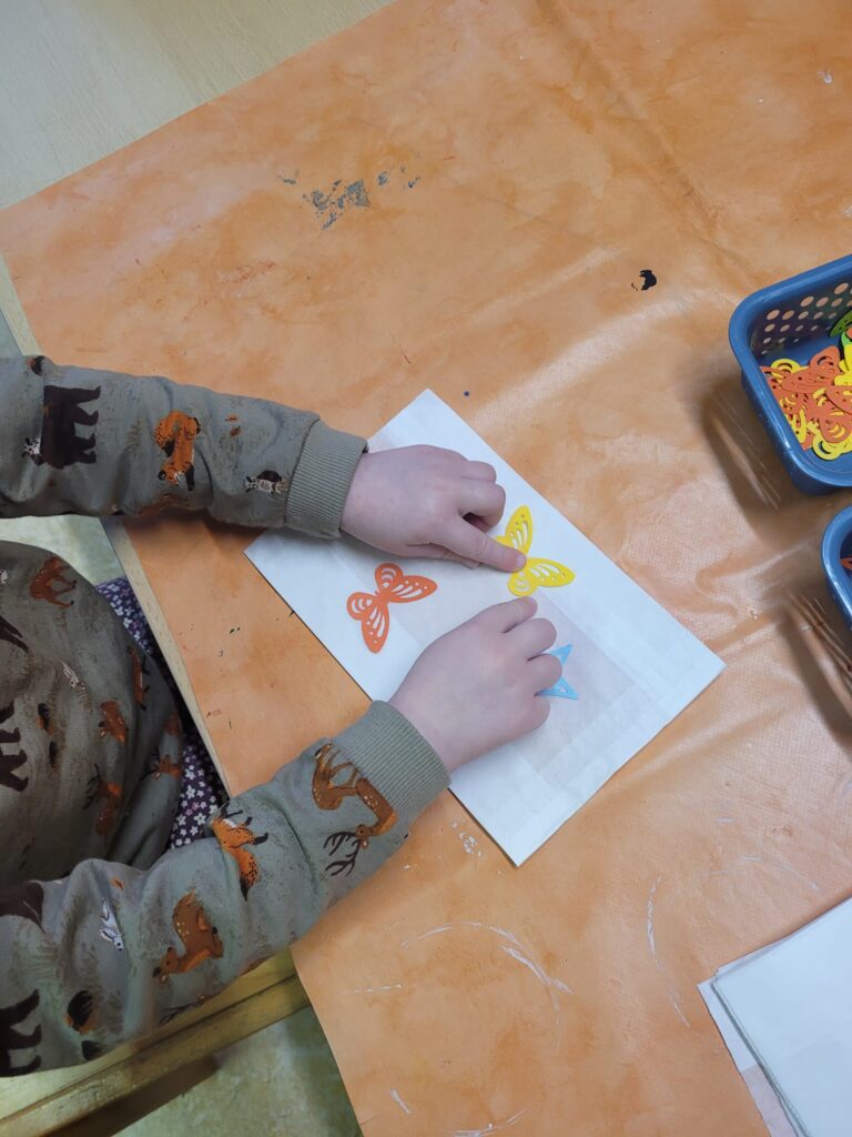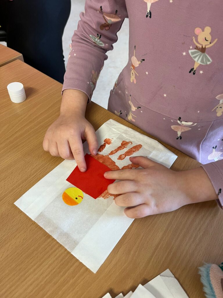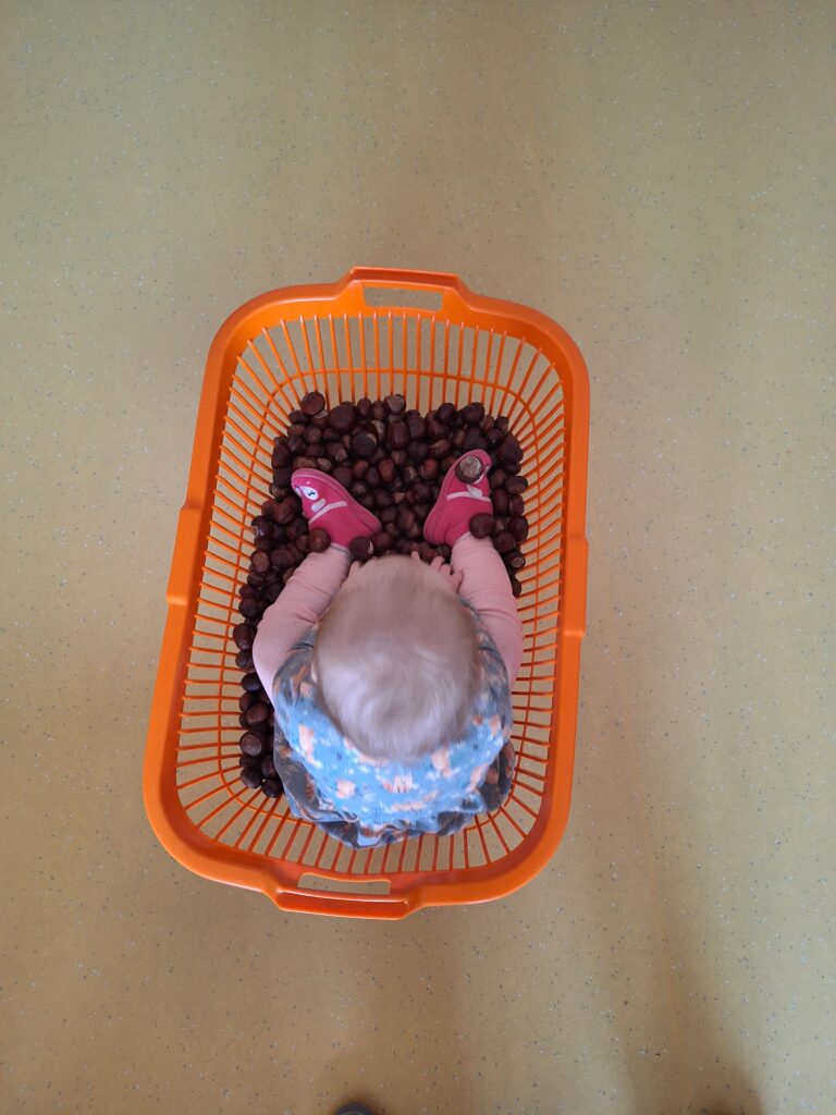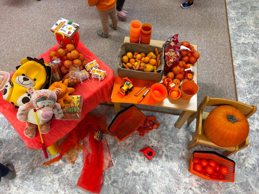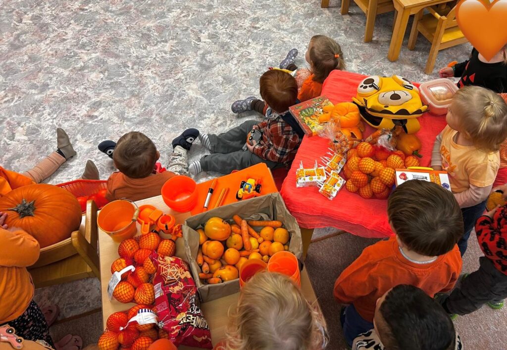 Sie druckten bunte Blätter mit Farben und gestalteten Drachen mit ihren Handabdrücken. Das Kastanienbad fühlte sich ganz kühl an, machte aber viel Spaß. Auch der orange Farbentag stand auf dem Programm: Ein herzliches Dankeschön an alle Eltern für die vielen mitgebrachten Sachen des Herbstes! Mit Spiel, Spaß und viel Bewegung lernten die Kinder die Farbe Orange kennen – und zum Abschluss gab es für jedes Kind einen Luftballon, eine Mandarine und einen orangen Lolli.