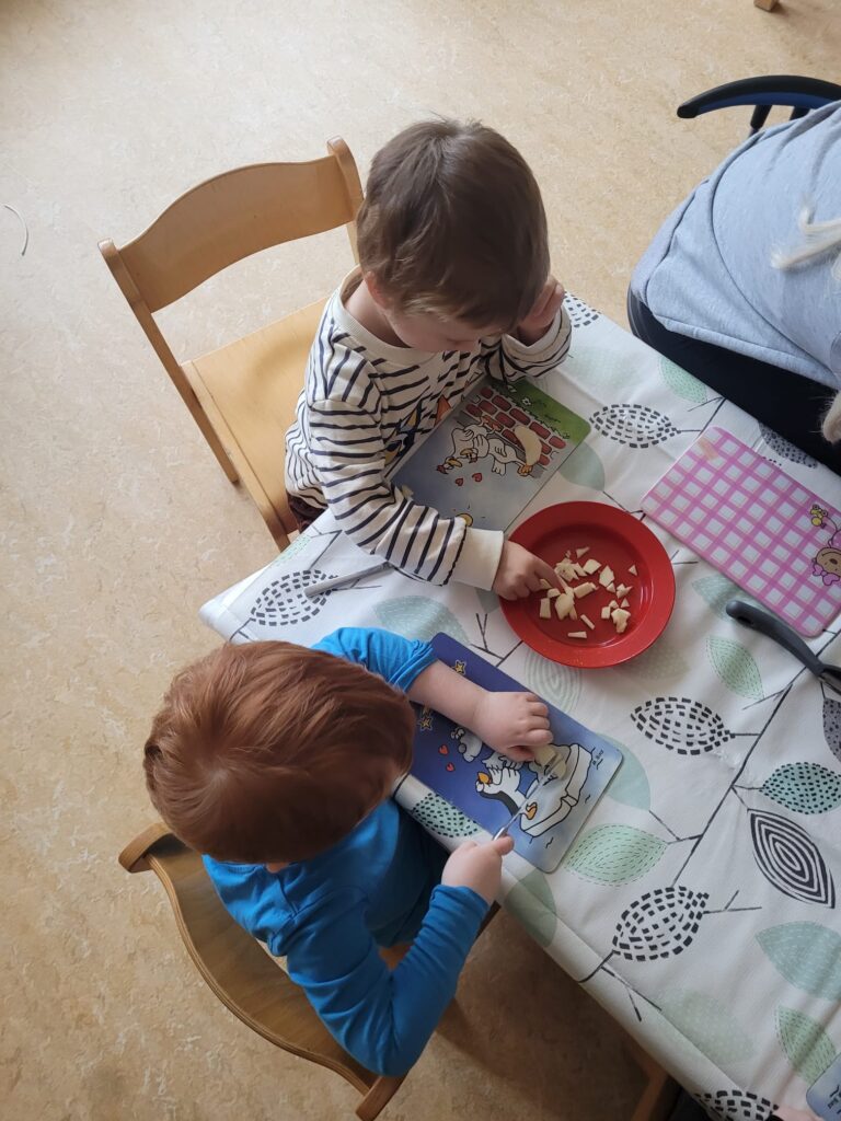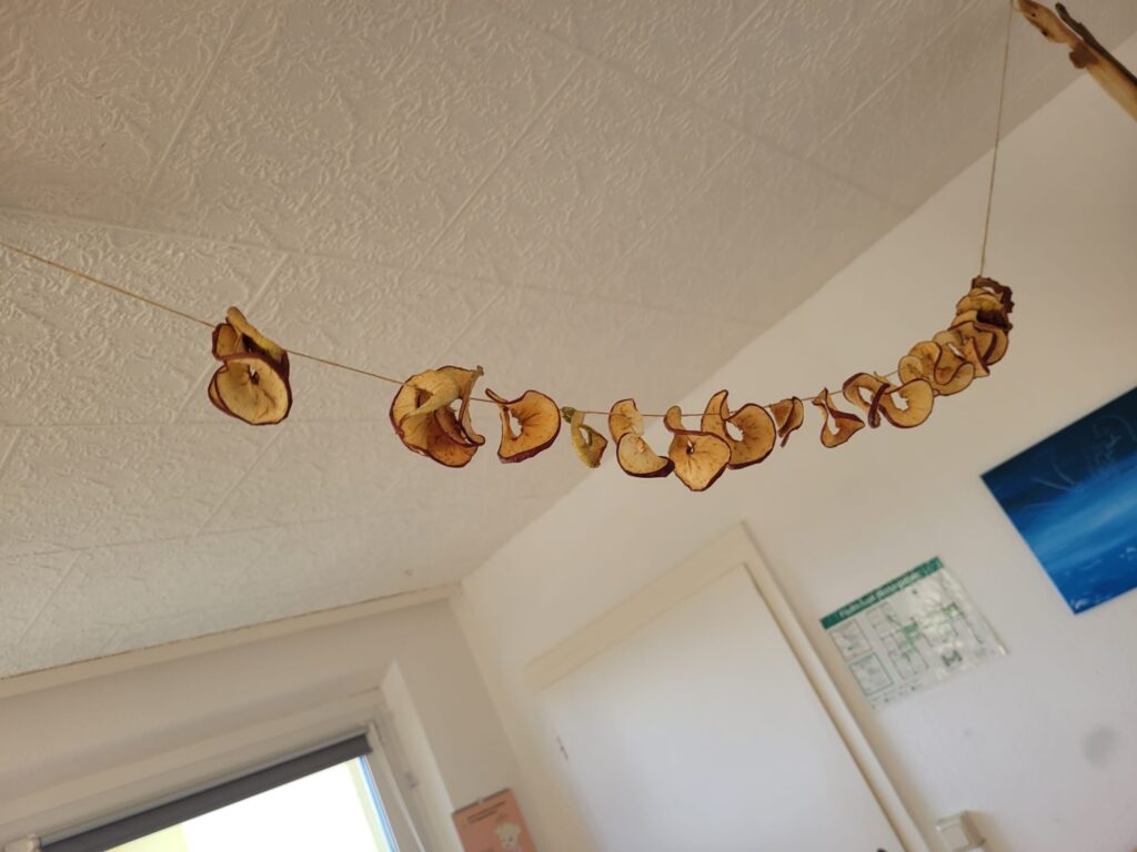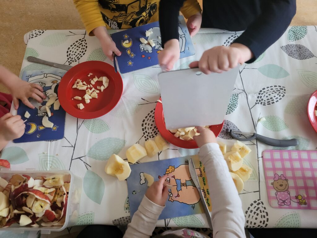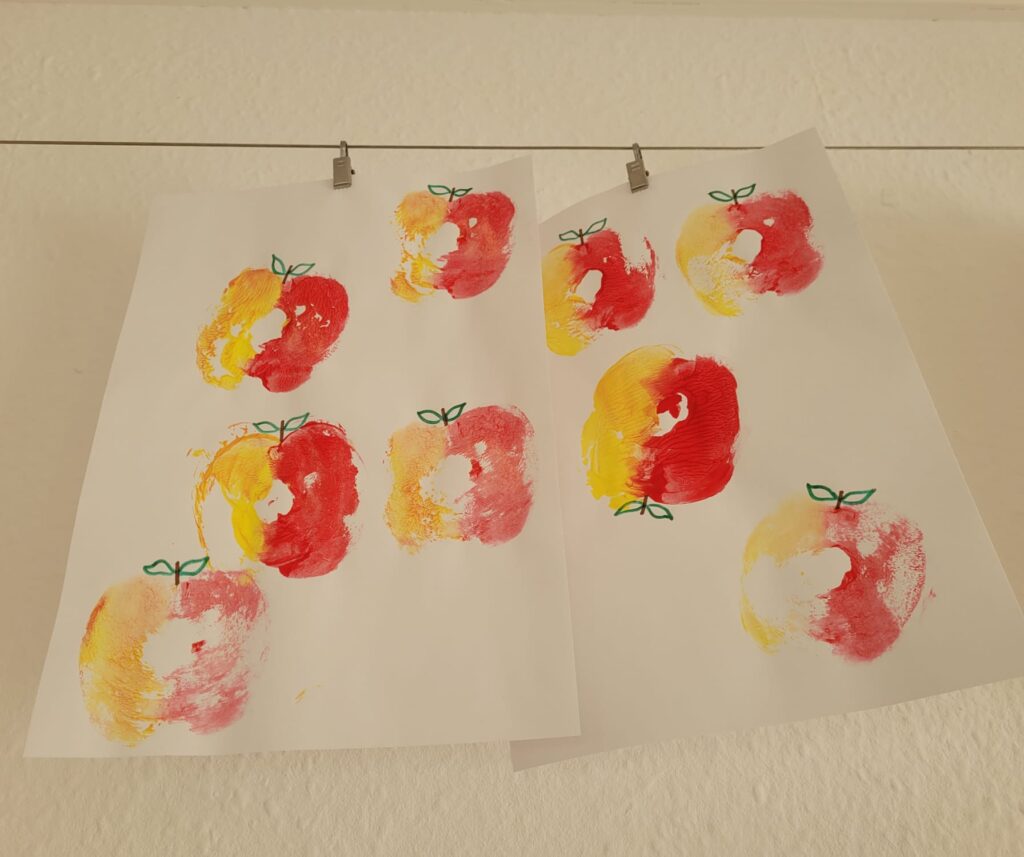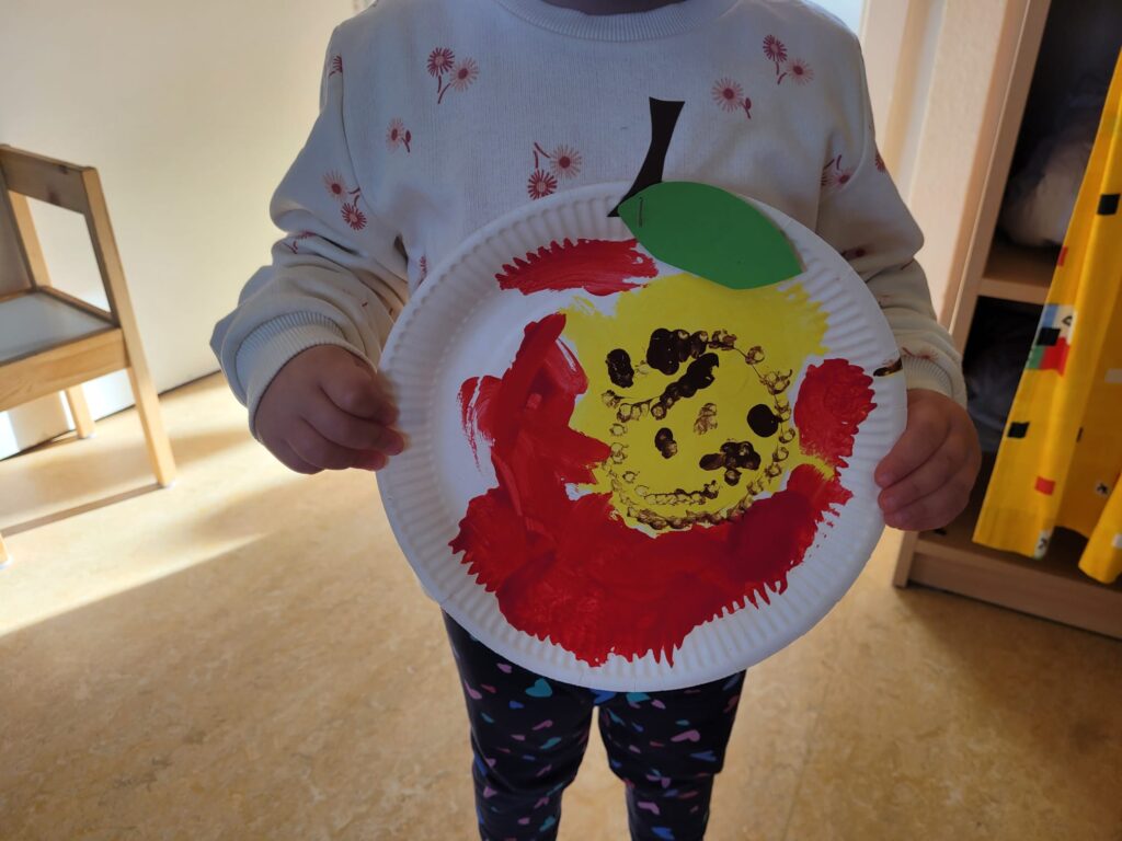 In einer Gruppe stand der Apfel im Mittelpunkt. Die Kinder lernten das süße Obst ganz genau kennen: Wie sieht ein Apfel eigentlich von innen aus? Wie schmeckt er – süß, sauer, knackig? Und was kann man alles daraus zaubern? Mit großem Eifer wurden Apfelmus, Apfelringe, Obstsalat und Apfelkuchen hergestellt – und natürlich auch probiert! Beim Apfeldruck entstanden kleine Kunstwerke und am Ende duftete der ganze Raum nach frischen Äpfeln und Herbst.