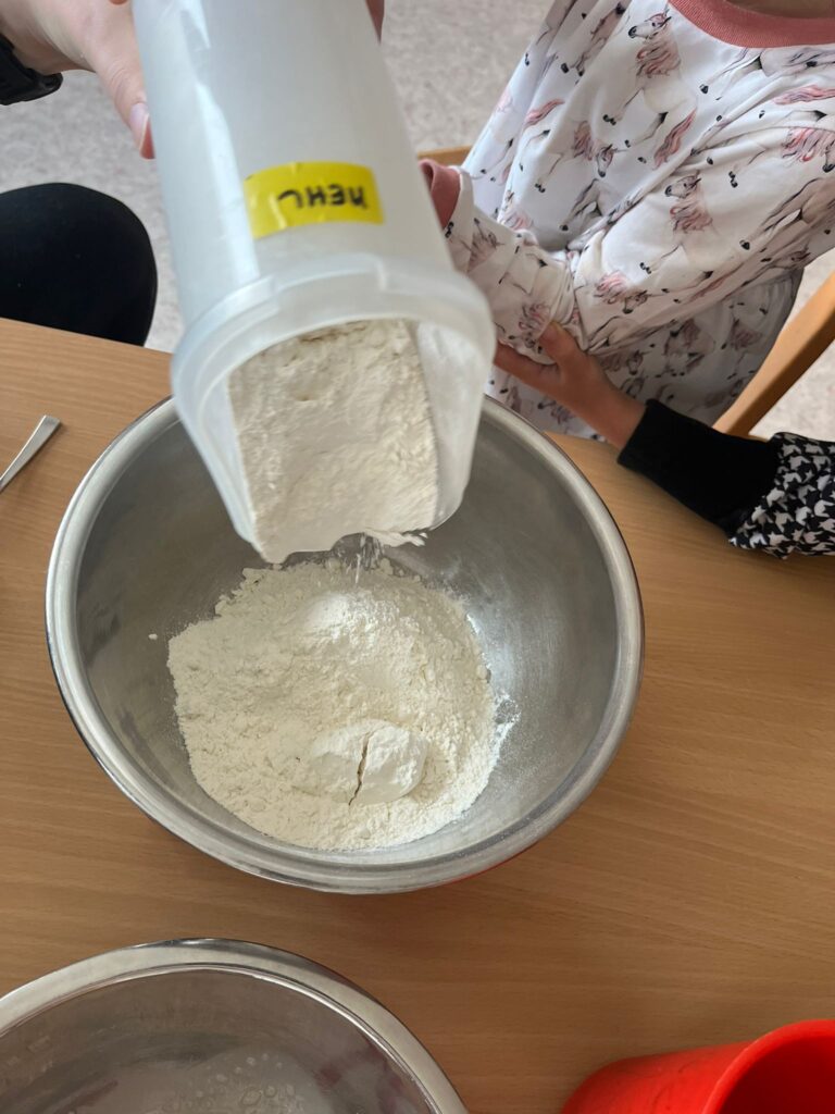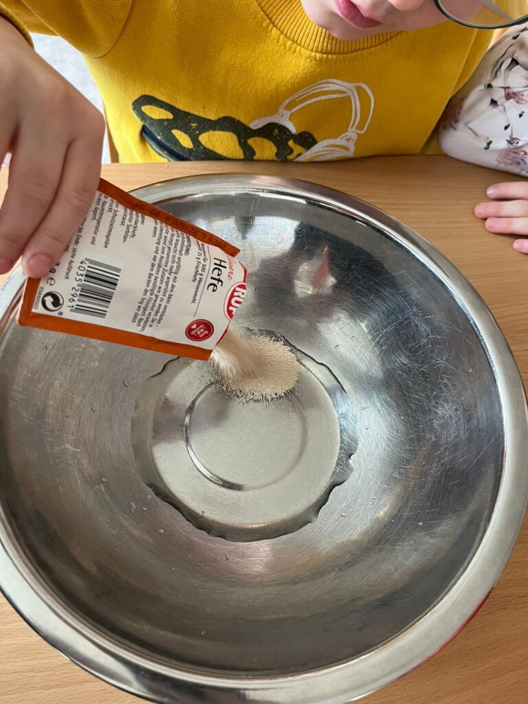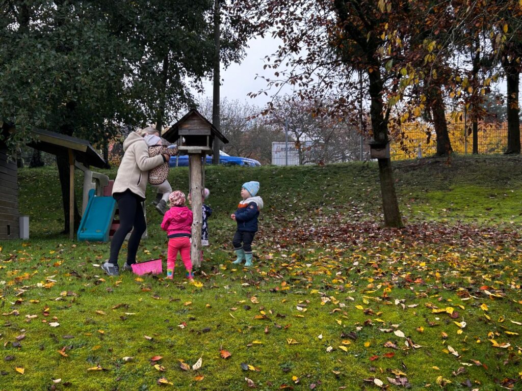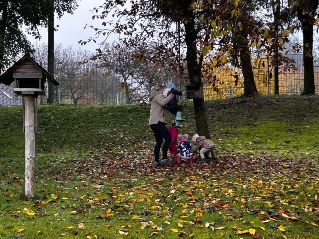 In der nächsten Gruppe wurde fleißig Brot gebacken. Mit Mehl an den Händen und einem Lächeln im Gesicht rollten die Kinder den Teig aus, formten zwei Laibe und beobachteten gespannt, wie aus dem Teig im Ofen herrlich duftendes Brot wurde. Nebenbei begann auch schon die kreative Vorbereitung auf den Martinstag – die ersten bunten Laternen wurden gebastelt und liebevoll gestaltet. Eine weitere Gruppe machte sich auf eine kleine Reise: Mit dem Zug ging es auf Entdeckungstour ins „Igelhieb“, wo das neue Kustelmännchen besucht wurde. Außerdem lernten die Kinder die verschiedenen Blätter der Bäume kennen, untersuchten ihre Unterschiede und Gemeinsamkeiten und entdeckten die Vielfalt der Natur hautnah – ein spannendes Erlebnis voller Bewegung, frischer Luft und staunender Augen.