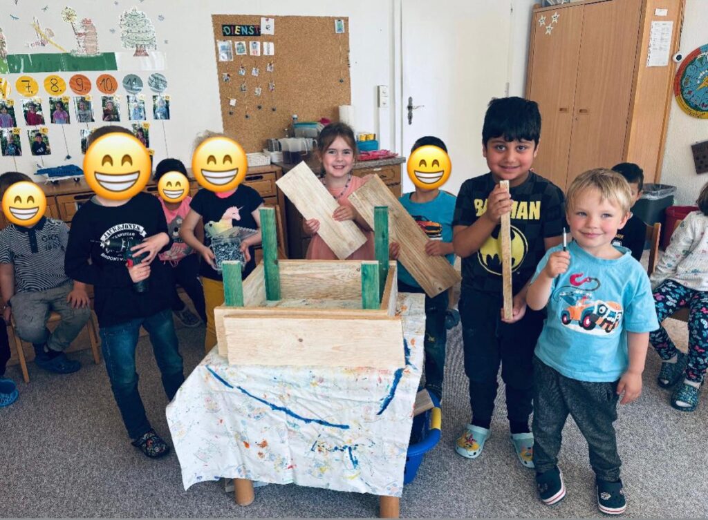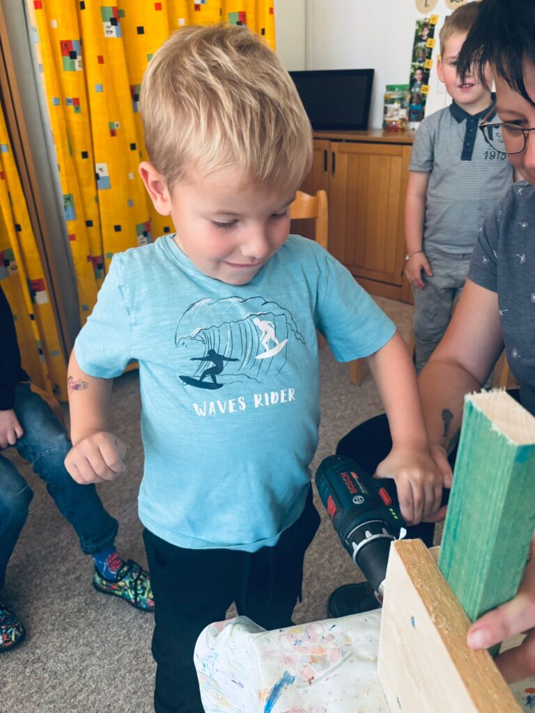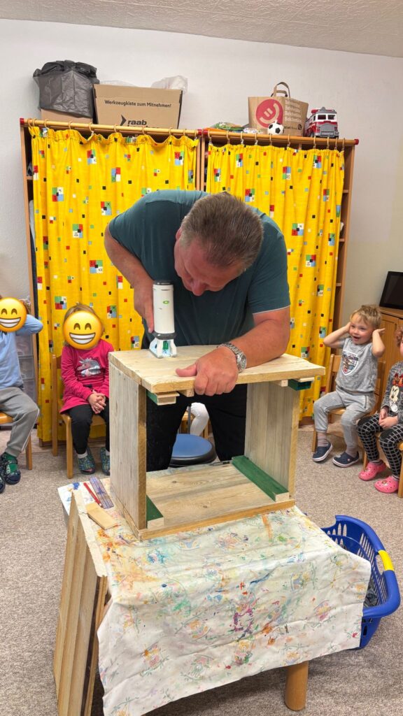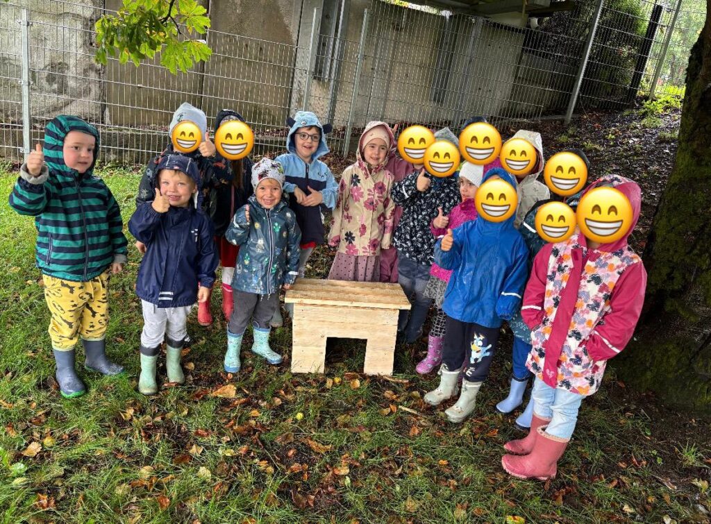 Die Vorbereitungen für den Winter: Vor ein paar Wochen entstand bei den Schmetterlingen ein Haus für den Igel, damit er für den Winterschlaf eine warme Unterkunft hat. Es wurde geschraubt, gebohrt, gestrichen und geschliffen.