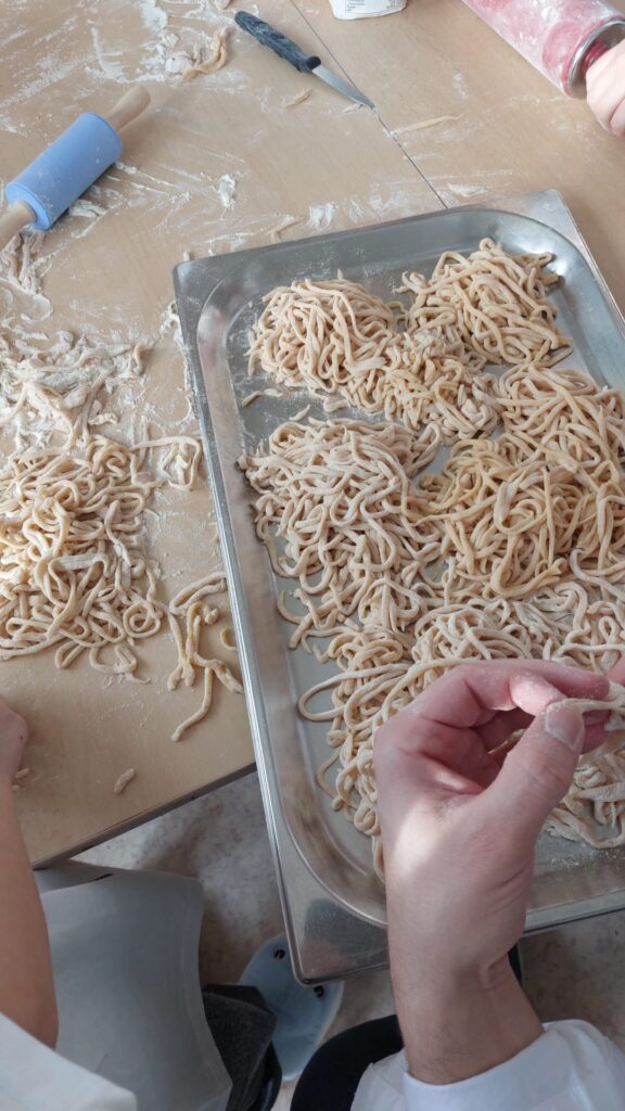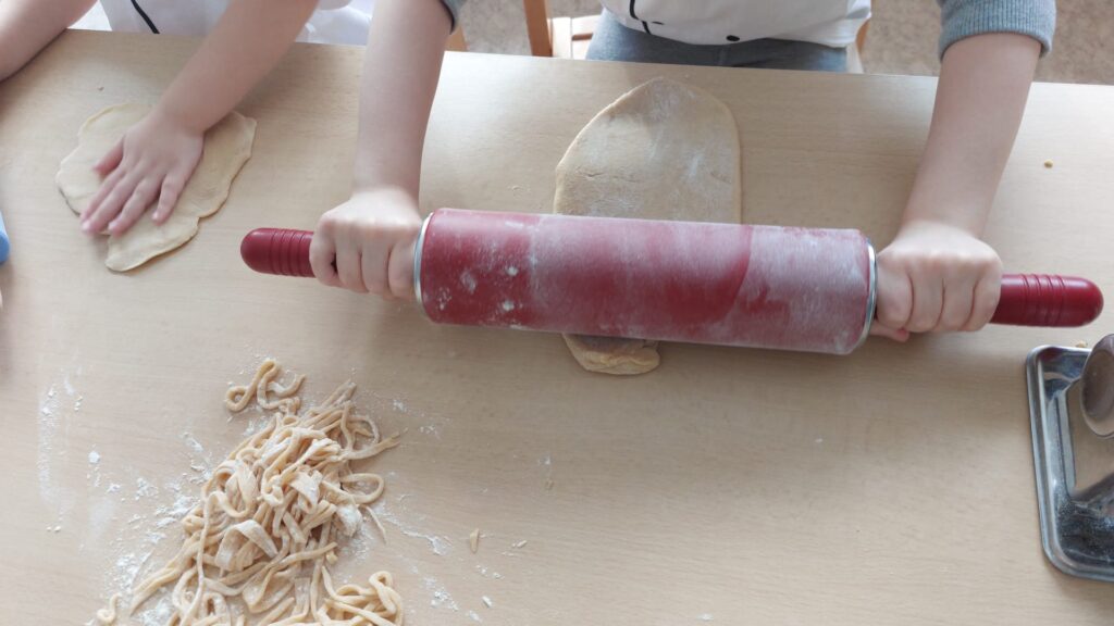 Zuerst wurde der Nudelteig gerollt, dann Gemüse für die Soße geschnitten – und anschließend natürlich gemeinsam gekocht und probiert.