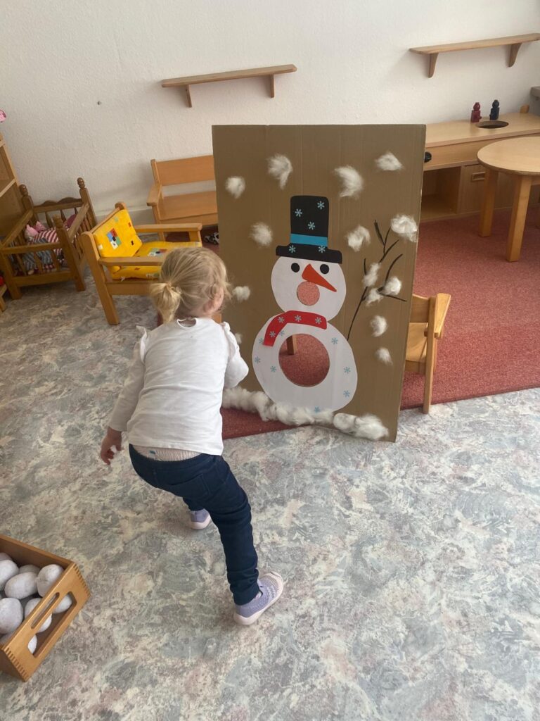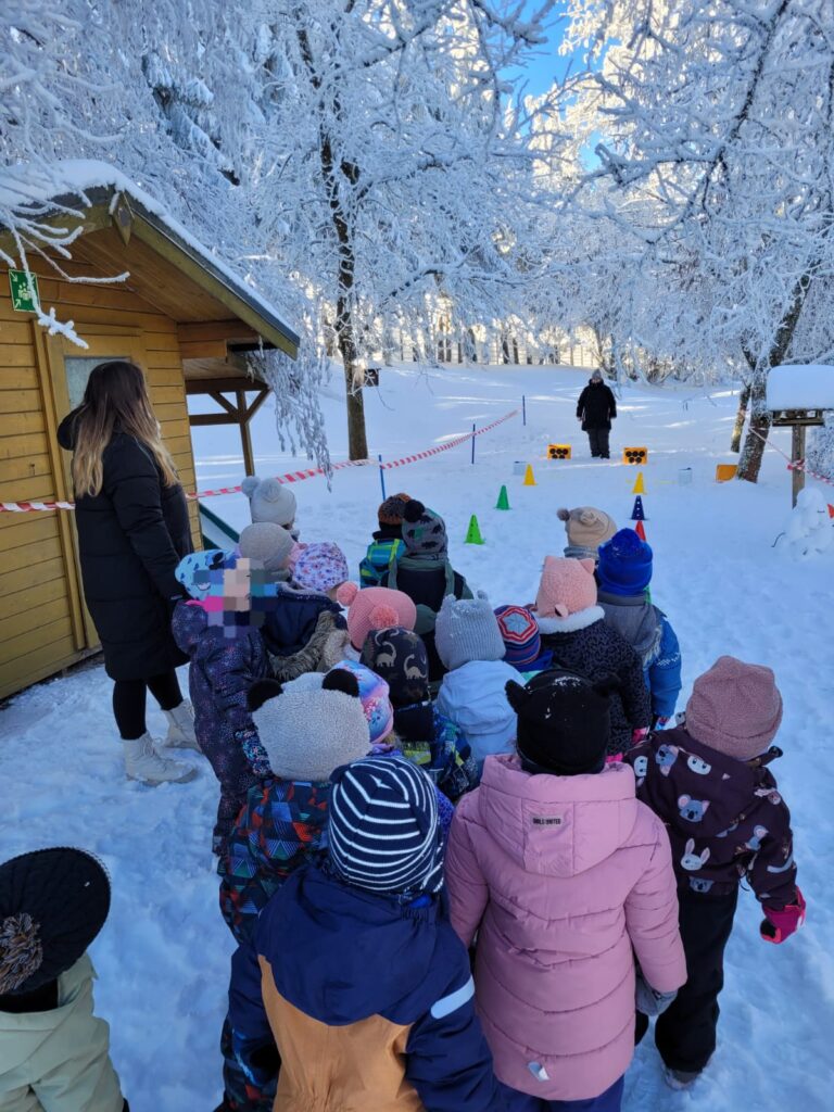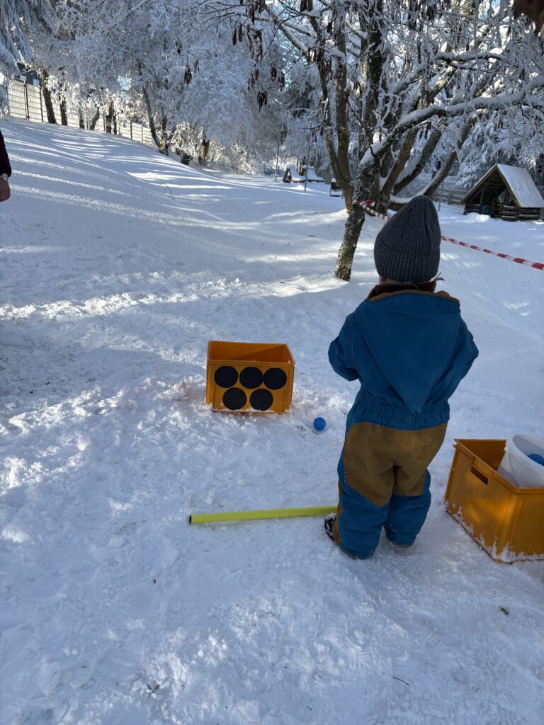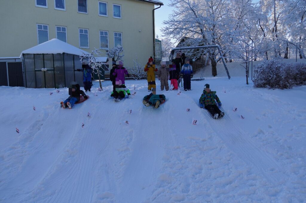 Auf dem Programm standen Eishockey, Biathlon mit Slalomlauf und anschließendem Zielwurf von fünf Bällen, die Nordische Kombination – bei der Sachen, die man im Winter so benötigt in einen Rucksack gepackt und ein Eiswürfel auf einem Löffel balanciert werden mussten – sowie Eiskunstlauf und Wettrodeln. Mit viel Freude, Neugier und Spaß an der frischen Luft waren alle Kinder mit vollem Einsatz dabei.