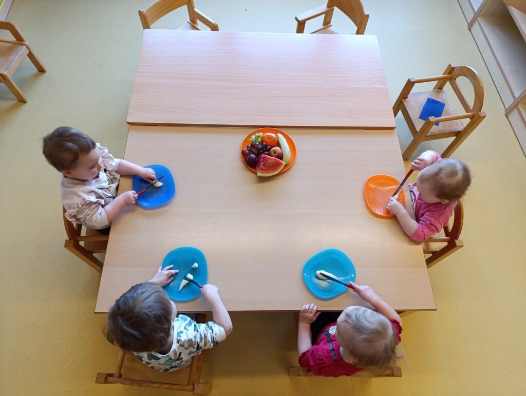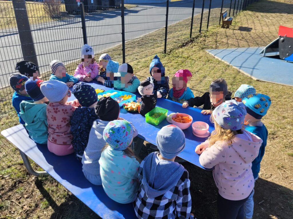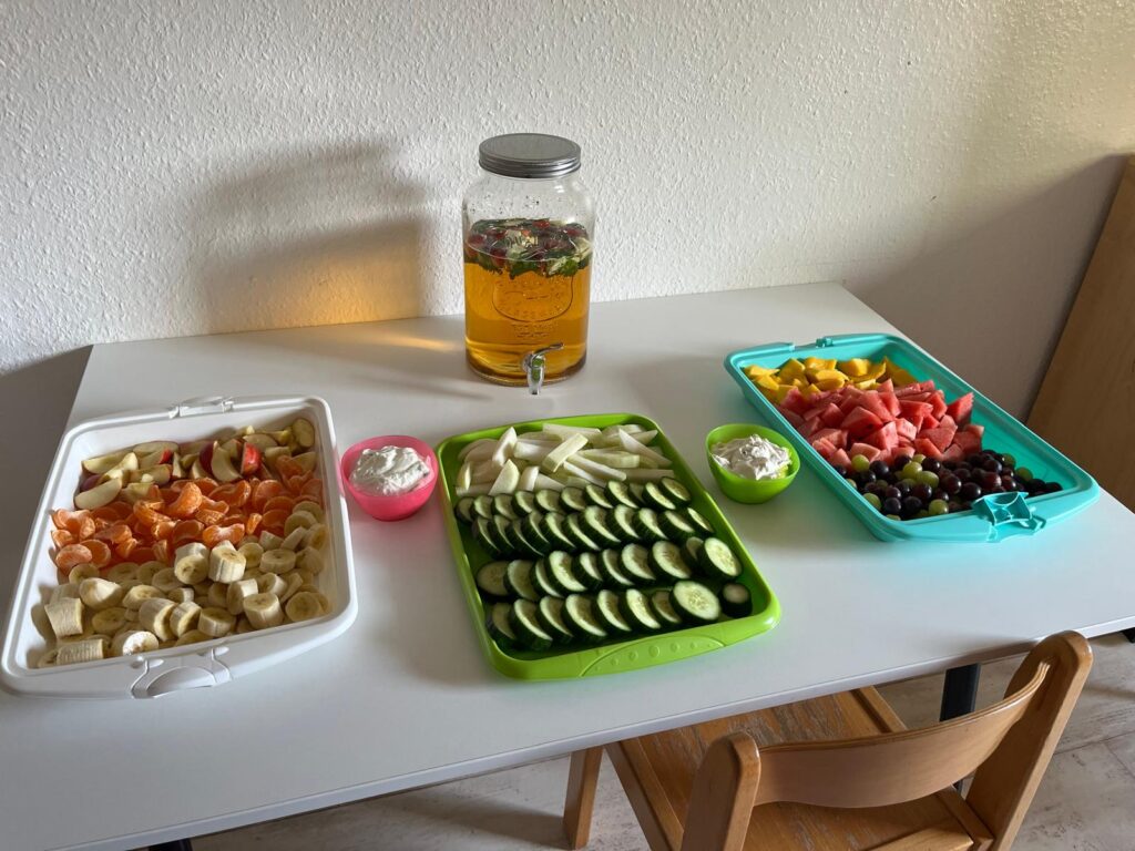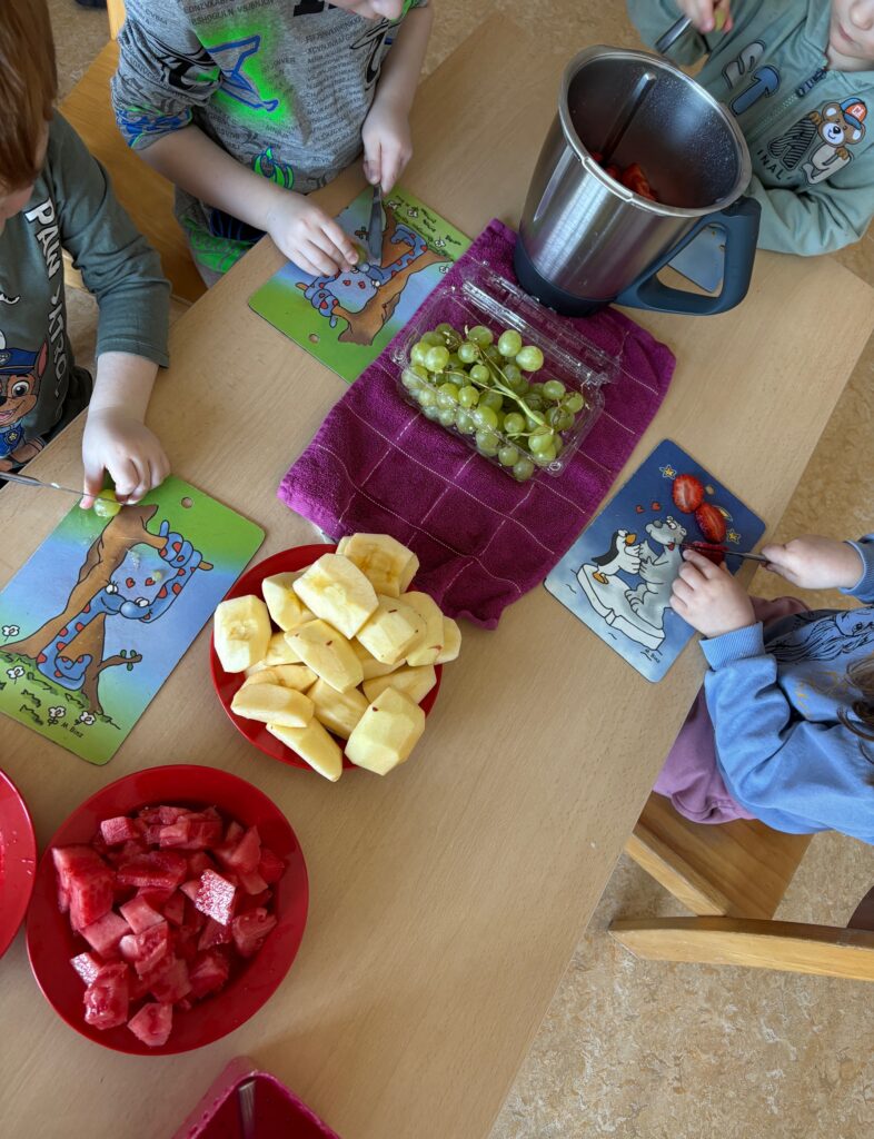 Auch im Tausendfüssler drehte sich am vergangenen Freitag alles rund um gesunde Lebensmittel. In den einzelnen Gruppen wurde fleißig geschnippelt, gerührt, gemixt und probiert. Die Wichtel bereiteten einen leckeren Obstsalat zu, während die Zwerge selbstgemachtes Knäckebrot herstellten. Bei den Käfern wurden ein fruchtiger Obstsmoothie und Bananenmilch zubereitet. Die Bienen genossen ein Obst- und Gemüsepicknick im Freien. Die Schmetterlinge stellten Kräuterlimo sowie einen Obst-Beeren-Joghurt her. Bei den Seepferdchen gab es eine Obst- und Gemüseplatte mit Dip, dazu Kräuterlimo und selbstgemachtes Heidelbeereis.