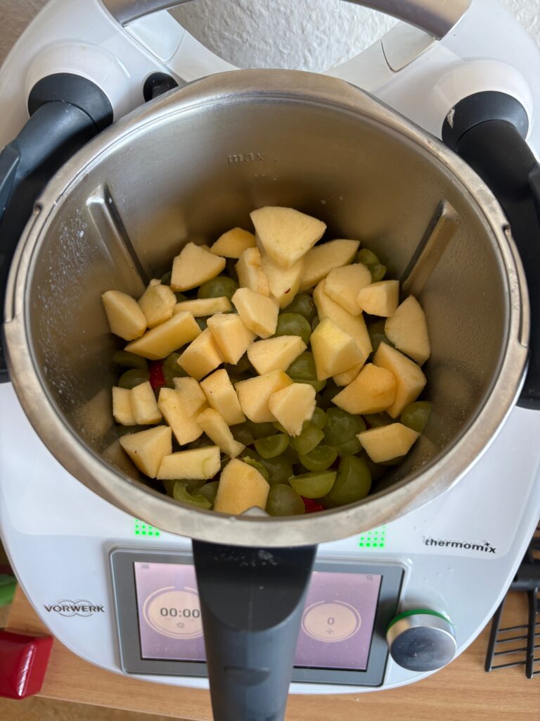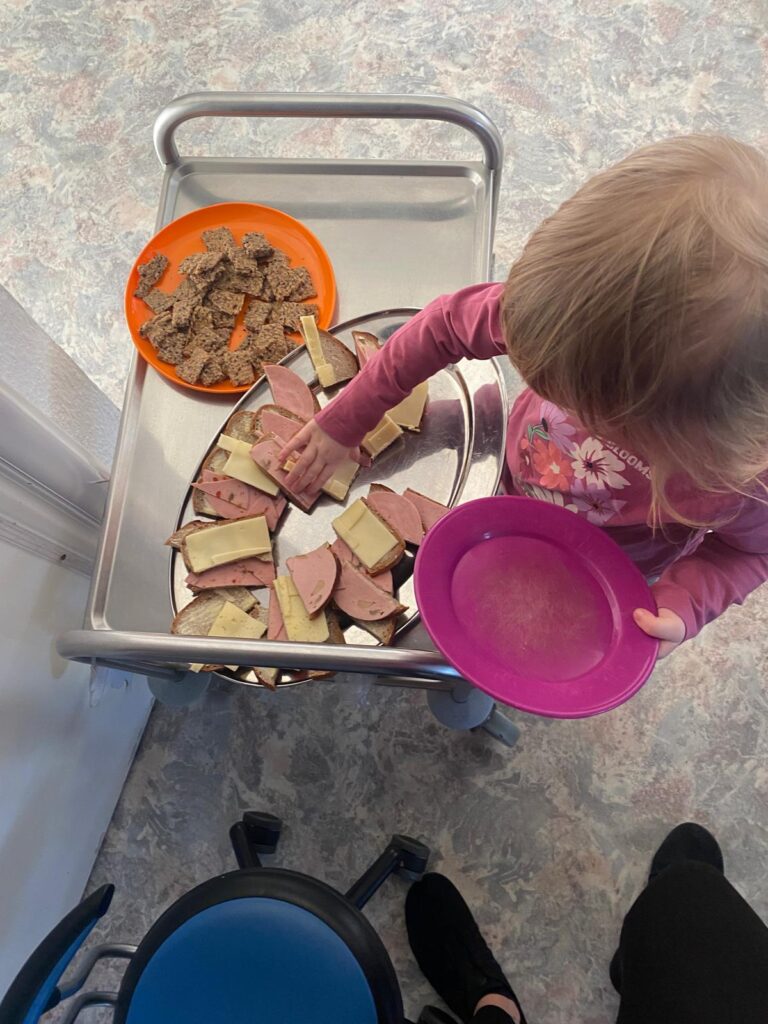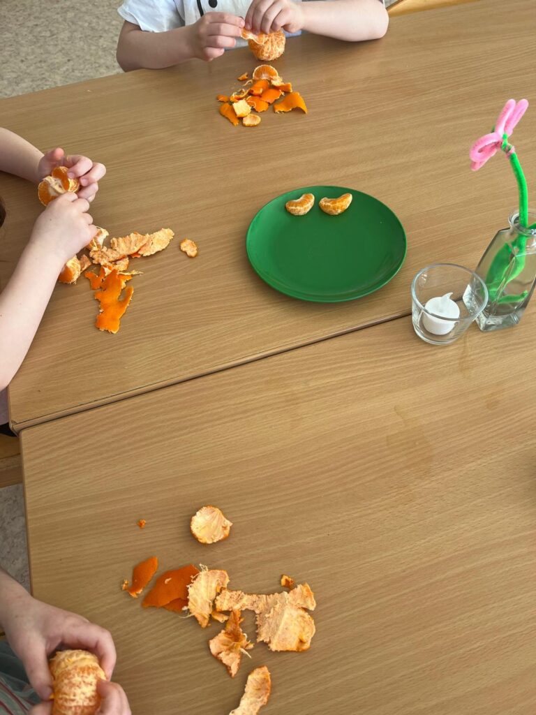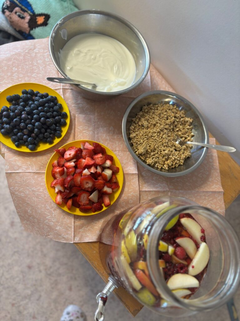 Auch im Tausendfüssler drehte sich am vergangenen Freitag alles rund um gesunde Lebensmittel. In den einzelnen Gruppen wurde fleißig geschnippelt, gerührt, gemixt und probiert. Die Wichtel bereiteten einen leckeren Obstsalat zu, während die Zwerge selbstgemachtes Knäckebrot herstellten. Bei den Käfern wurden ein fruchtiger Obstsmoothie und Bananenmilch zubereitet. Die Bienen genossen ein Obst- und Gemüsepicknick im Freien. Die Schmetterlinge stellten Kräuterlimo sowie einen Obst-Beeren-Joghurt her. Bei den Seepferdchen gab es eine Obst- und Gemüseplatte mit Dip, dazu Kräuterlimo und selbstgemachtes Heidelbeereis.